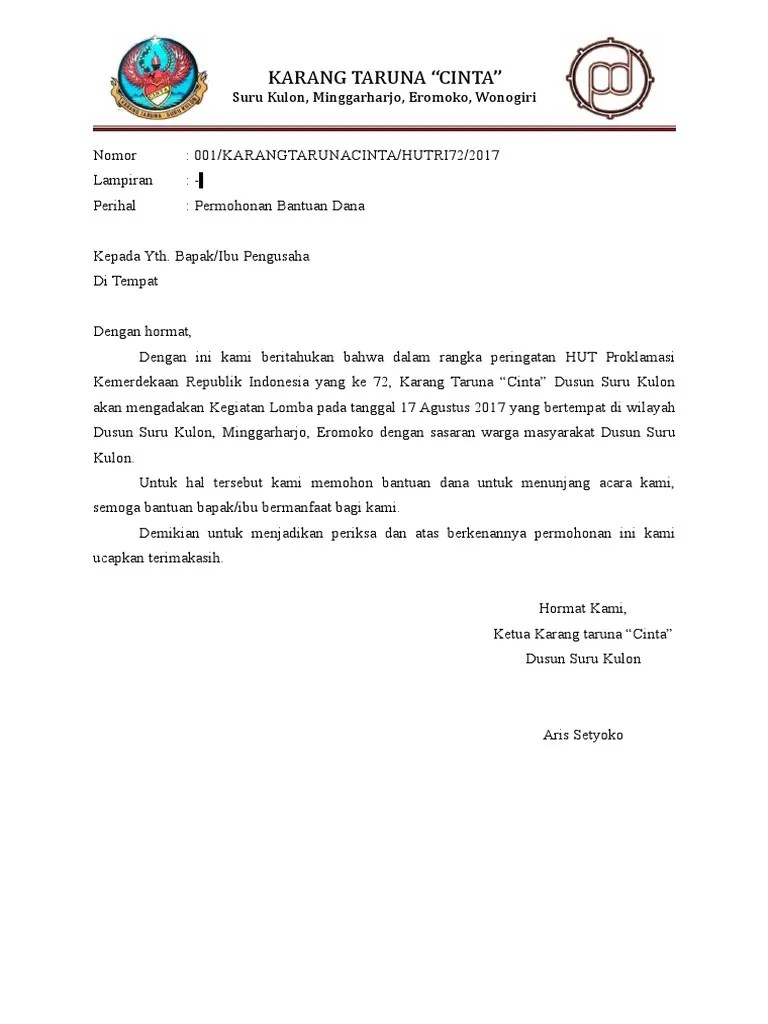 Contoh surat permohonan bantuan dana dan proposal kegiatan hut ri … proposal bantuan dana kegiatan 17 agustus contoh proposal 17 agustus . Contoh surat permohonan bantuan dana dan proposal kegiatan hut ri contoh proposal pengajuan dana kegiatan 17 agustus contoh surat permohonan . Jum'at 17 agustus 1945 pada bulan ramadhan, indonesia memproklamirkan kemerdekaan . 17 agustus yang benar ini diperlukan agar permohonan dana pada donatur. Surat permohonan dana hut ri.doc.